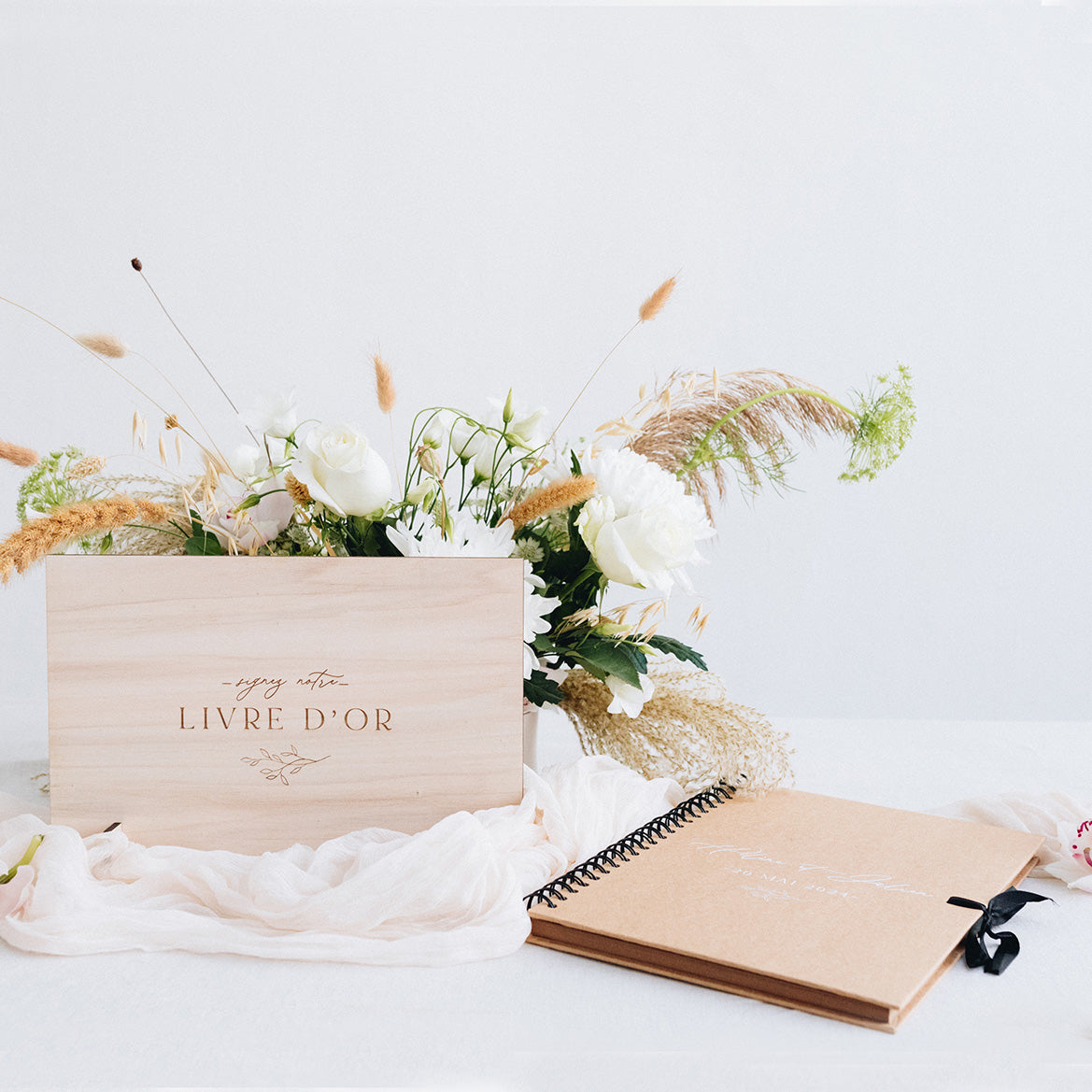 Découvrez notre panneau "Livre d'or" en bois gravé Nomad. Imaginé par Les Mignonneries, il est à poser près de votre livre d'or le jour de votre mariage.