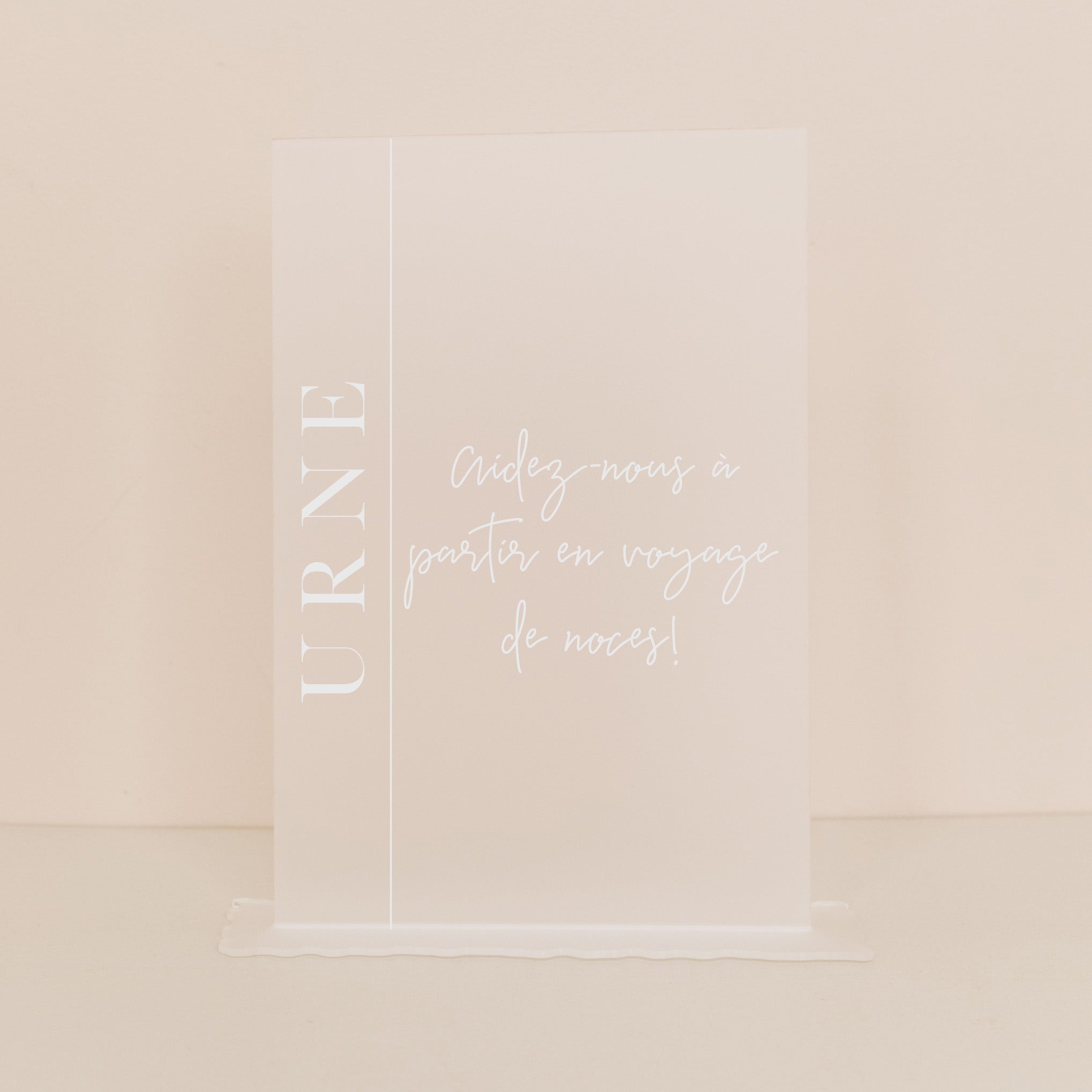 Découvrez notre panneau "Urne" en plexi givré et sticker blanc Frost. Imaginé par Les Mignonneries, il est à poser près de votre urne le jour de votre mariage.