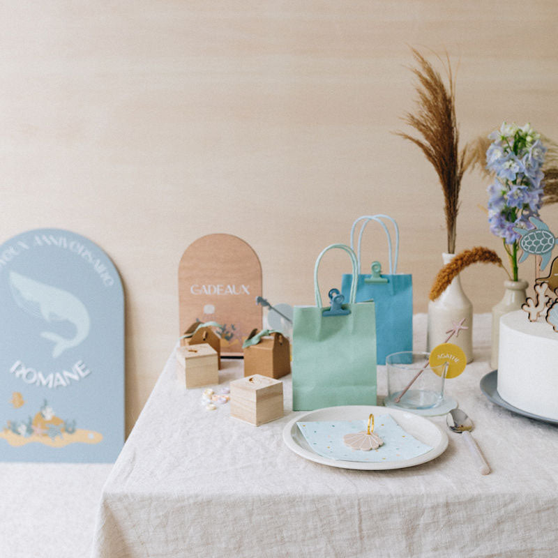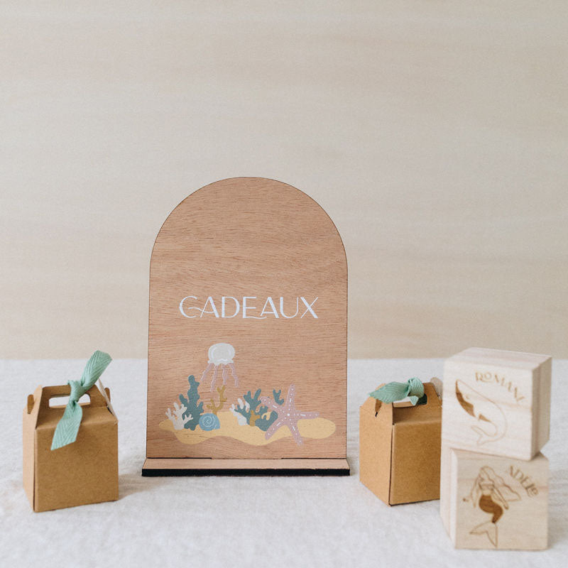 Découvrez notre panneau Océan en bois imprimé à personnaliser avec le texte de votre choix pour différencier les espaces cadeaux, table des enfants, bonbons ou gâteau.